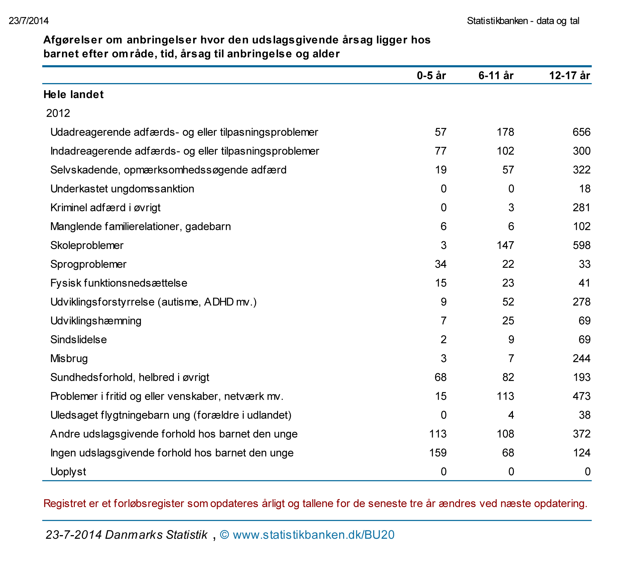 Af ren nysgerrighed, gennemførte jeg en mindre statistisk undersøgelse via Danmarks Statistik, hvor jeg ønskede at se hvor mange unge, der blev anbragt udenfor eget hjem, som funktion af deres alder, men hvor det også oplyses, hvad der var afgørende for anbringelsen uden for eget hjem, blev gennemført.