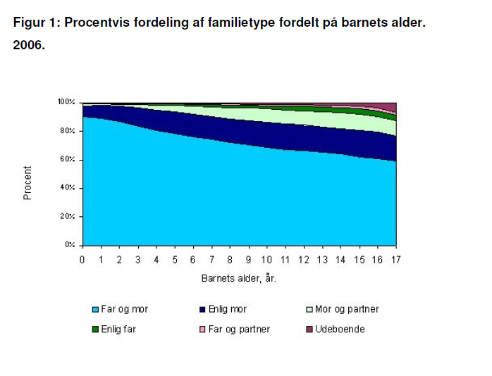 Nedenstående figur viser procentdelen af børn i alderen 0-17 år i 2006, som bor henholdsvis sammen med mor og far, enlig far, enlig mor, mor og partner, far og partner samt udenfor hjemmet. Heraf ses, at 90% af de 0-årige bor sammen med deres far og mor, mens dette tal er 62% blandt 15-årige og 59% blandt 17-årige.