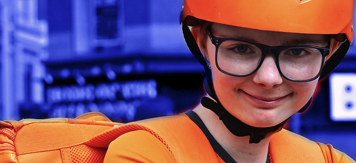 Pludselig ser jeg et Just Eat bud, der skal aflevere mad til nogle festende mennesker, på Københavns Rådhusplads.