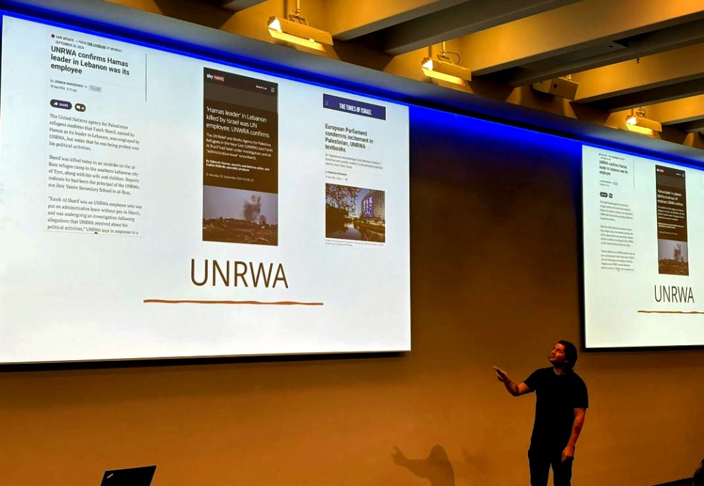 Den israelske talsperson og journalist Jotam Confino, der holdt foredraget, har tidligere været kendt for at fremme argumenter til fordel for Israels bosættelser og for at kritisere medierne for deres dækning af konflikten. Hans synspunkter er langt fra neutrale og kritiseres af mange, for at ignorere de humanitære konsekvenser af Israels politik.